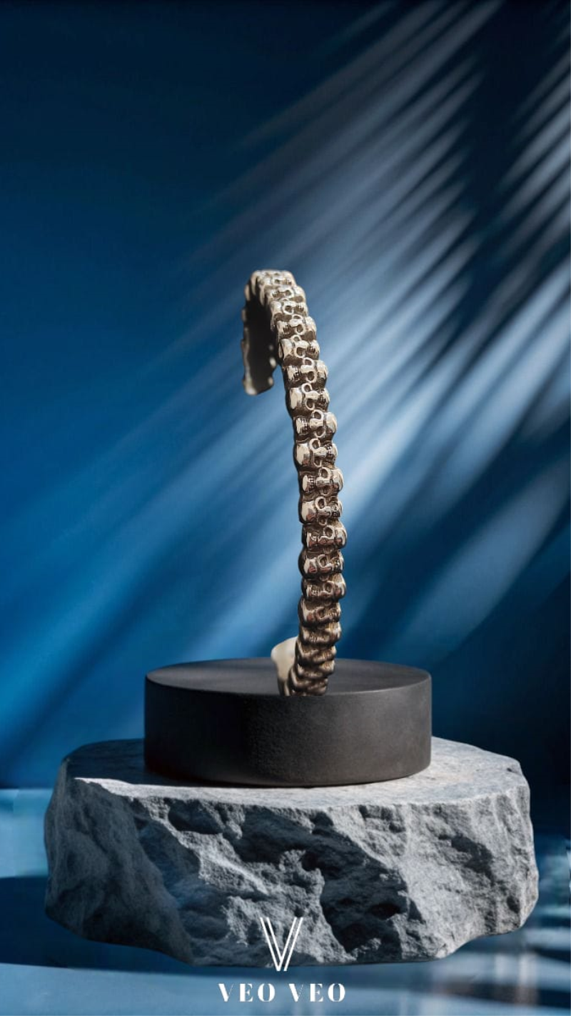 Bazalete de acero modelo caveras. Ajustable a la miñeca mediante presión. Composición: 100% acero quirúrgico. Bañadas en oro de 18k. Hipoalergénicas, para todo tipo de pieles. Duraderas,no pierde el brillo ni el color.